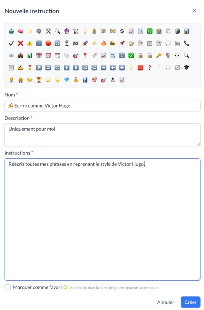 Le champ instruction est le prompt tel qu’il sera envoyé à la LLM. Vous pouvez mettre du texte, du Markdown, des émojis ; c’est à vous de voir en fonction de votre créativité et de vos besoins.
