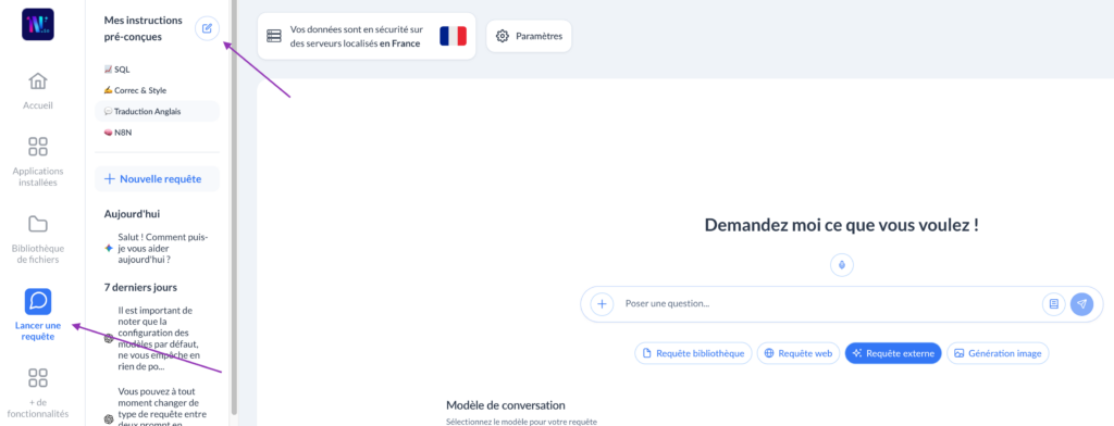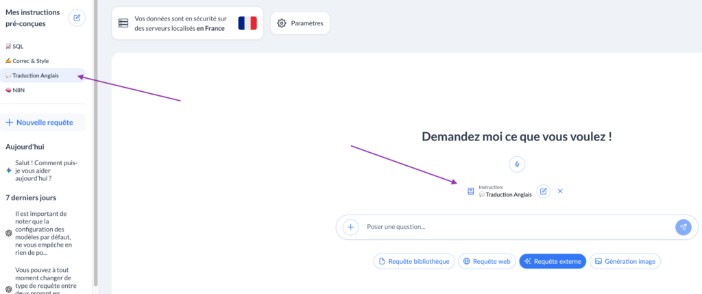 Vous pouvez ajouter une instruction depuis votre section « Mes instructions pré‑conçues » dans l’espace « Lancer une requête ».