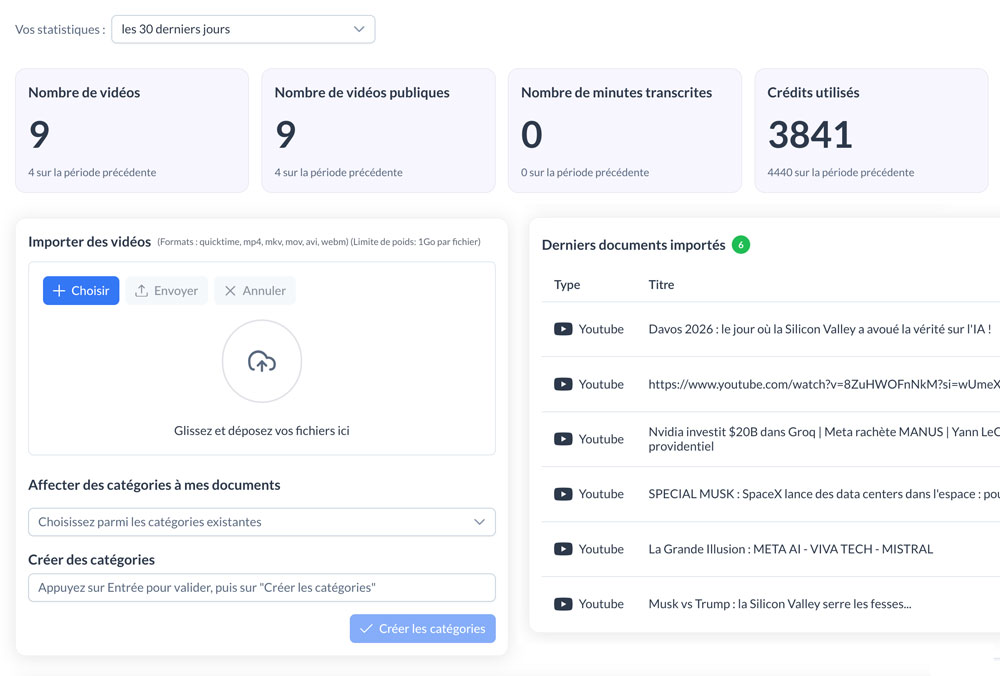 Importez toutes vos vidéos, exploitez-en la transcription, le résumé et les passages clés… puis retrouvez et réutilisez leur contenu en quelques secondes.